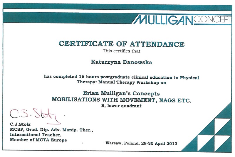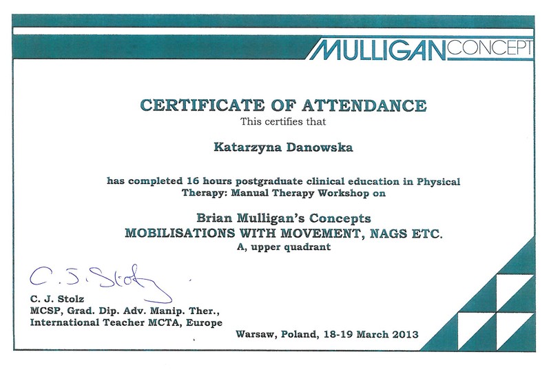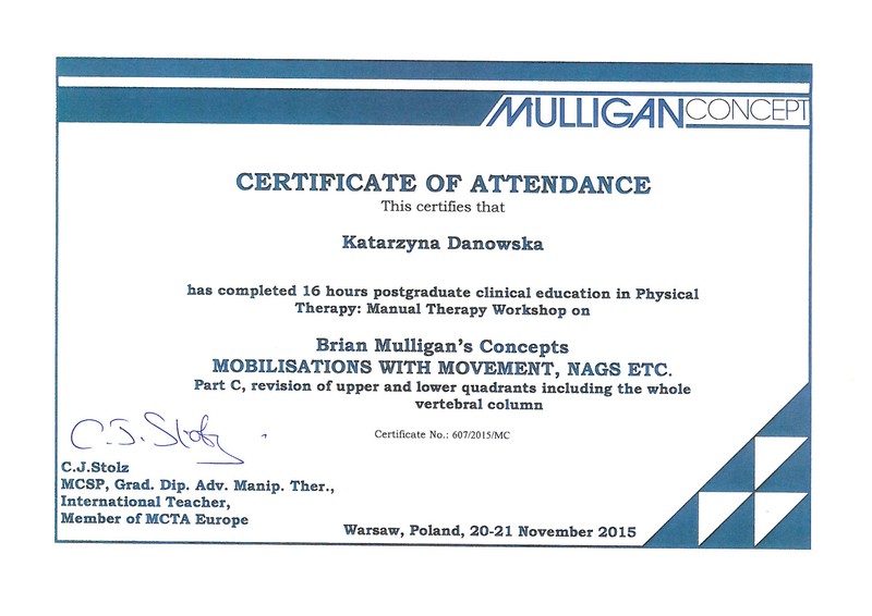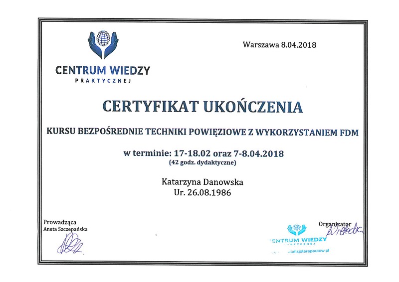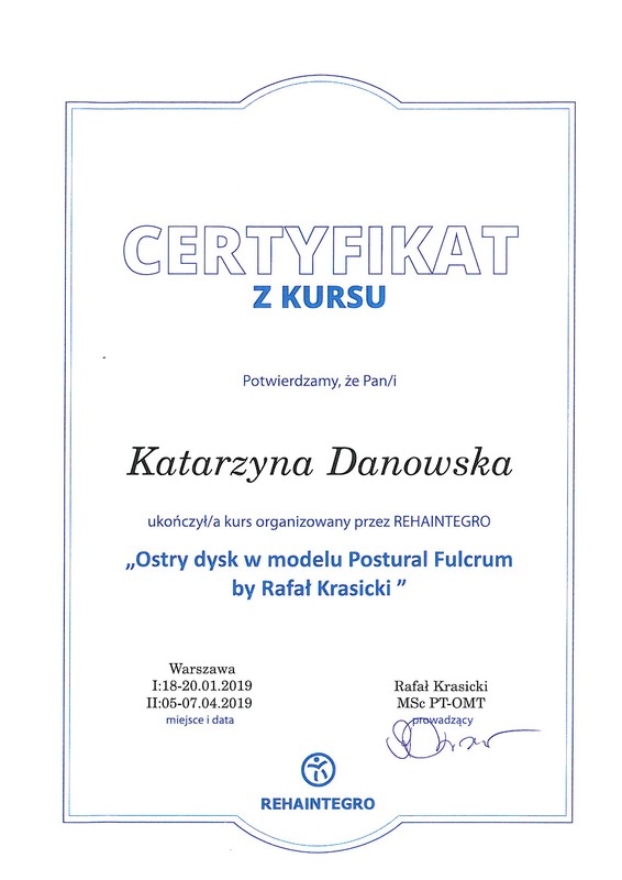 Jestem fizjoterapeutką i instruktorką aerobiku. W 2010 roku ukończyłam studia magisterskie na Warszawskim Uniwersytecie Medycznym i od tamtej pory zdobywam doświadczenie w pracy z ciałem pacjenta. Jestem absolwentką licznych szkoleń z zakresu fizjoterapii ortopedycznej, neurologicznej i uroginekologicznej. Swoją wiedzę medyczną połączyłam z zamiłowaniem do aktywności fizycznej, stąd pierwsze szkolenia z aerobiku, pilatesu i innych form zajęć ruchowych. Systematycznie poszerzam swój warsztat pracy i planuje dalszy rozwój.